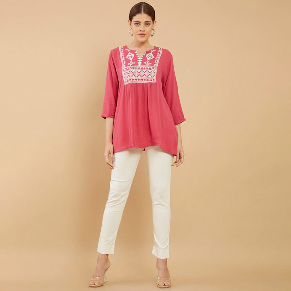 Pink & White Viscose Rayon Embroidered Tunic