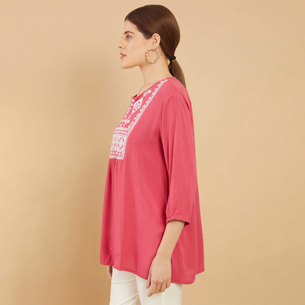 • "Pink and white embroidered tunic ,has a v-neck, three-quarter sleeves