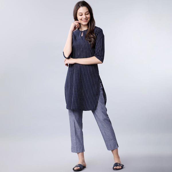 • "Navy Blue and White striped Tunic, has a round neck, three-quarter sleeves, and button closure
